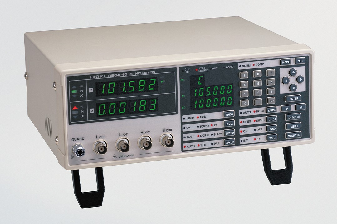 C测试仪 3504-40封装机、分选机、电容器的合格与否的判断和等级分类等C、D 2项目测试 能以恒定电压测量大容量的多层陶瓷电容 测试源频率: 120Hz, 1kHz 高速测量: 2ms RS-232C● 高速测量2ms ● 能根据C 和D (损耗系数*2)的测量值,进行被测物合格与否的判断● 对应测试线,比较器功能/触发输出功能● 3504-60/-50用BIN的分