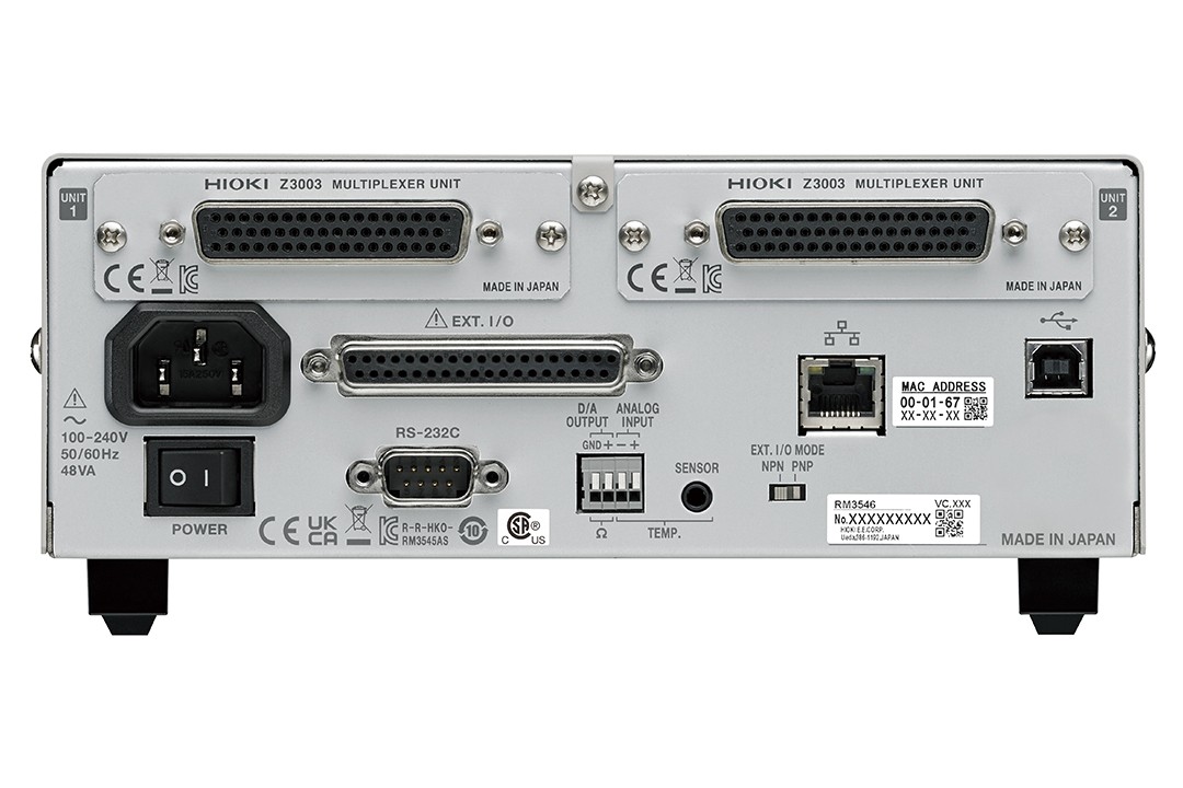 | 内置多路转换器(选件) | 多路转换器单元Z3003 可搭载数量:最多2个单元 最大通道数:20通道(4线式),42通道(2线式) 切换时间:30 msec |