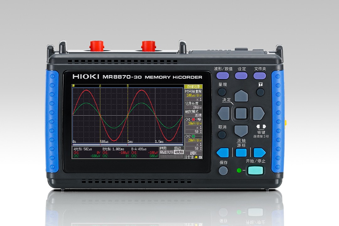 存储记录仪 MR8870-30和示波器一样,1台即可观测波形和记录真有效值的变化!2种模式:瞬间波形模式和真有效值的记录模式 最大2通道+4个逻辑通道 1 MS/s 内存 2 MW (1 ch) 12bits A/D 分辩率 电池或AC适配器操作 CF卡● 除了瞬间波形模式,还新增加了真有效值变化的记录模式● 可实时保存至CF卡中● 通过2台同步+附件PC应用软